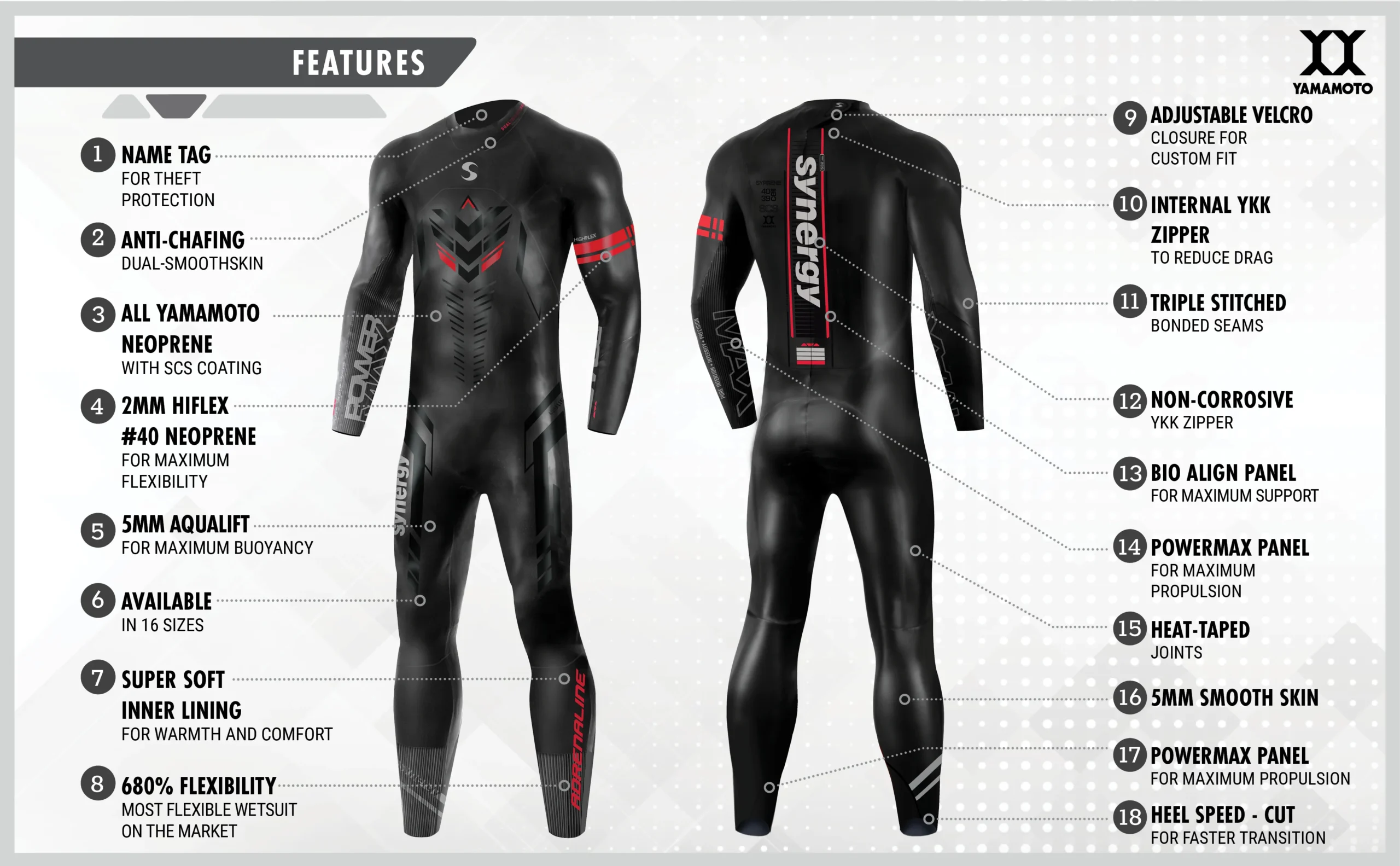 This tri wetsuit was originally developed for World Champion Emma Comerford. Emma needed an incredibly flexible suit because she had injured her shoulder. The Adrenaline is extremely flexible and has optimum balance. This style is considered one of the best wetsuits on the market because it has all the features of the Synergy Fullsleeve Hybrid without the Aerodome neoprene!